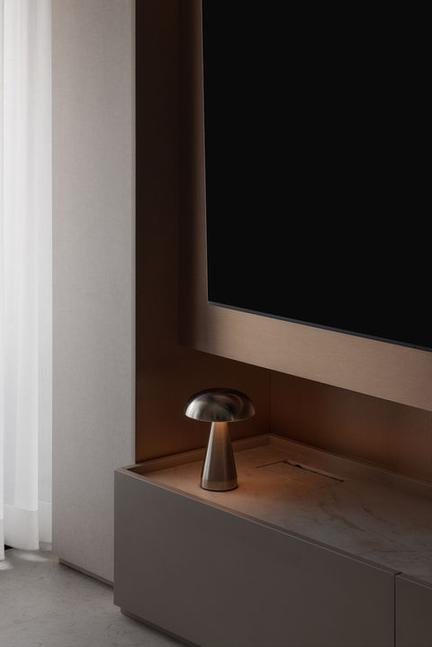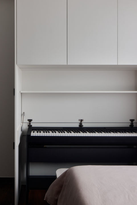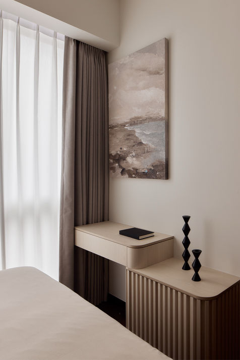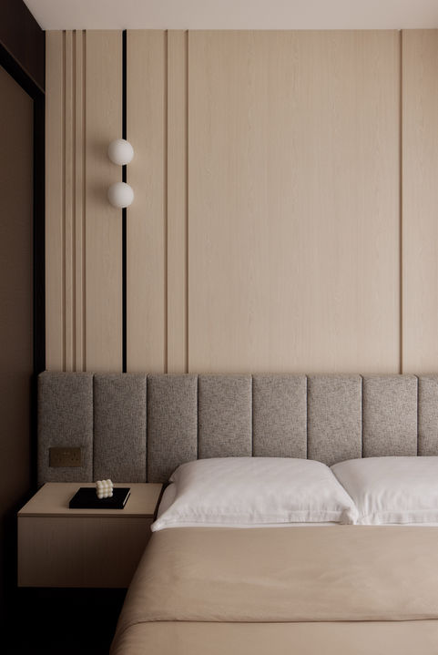 In the master bedroom, we drew inspiration from the serene and indulgent atmosphere of a luxury hotel. A custom fluted panel with a padded cushion bedhead serves as the focal point, offering both style and comfort. To maximize functionality, we incorporated a bespoke dresser and built-in storage units, seamlessly blending practicality with design.