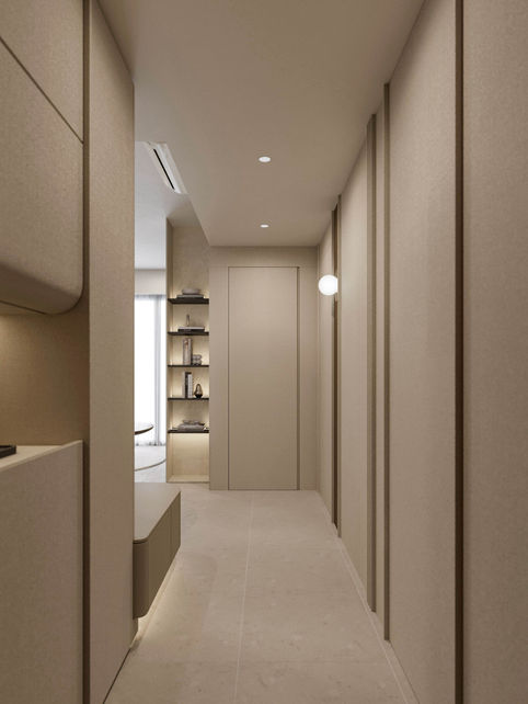 Reimagining the 893-square-foot condominium at Upper Bukit Timah for a family of four, along with their helper, meant transforming a compact space into a modern sanctuary. By reconfiguring the layout—achieved by demolishing a wall in the living area—we opened up the home to create a more fluid and functional design tailored to the family’s lifestyle.